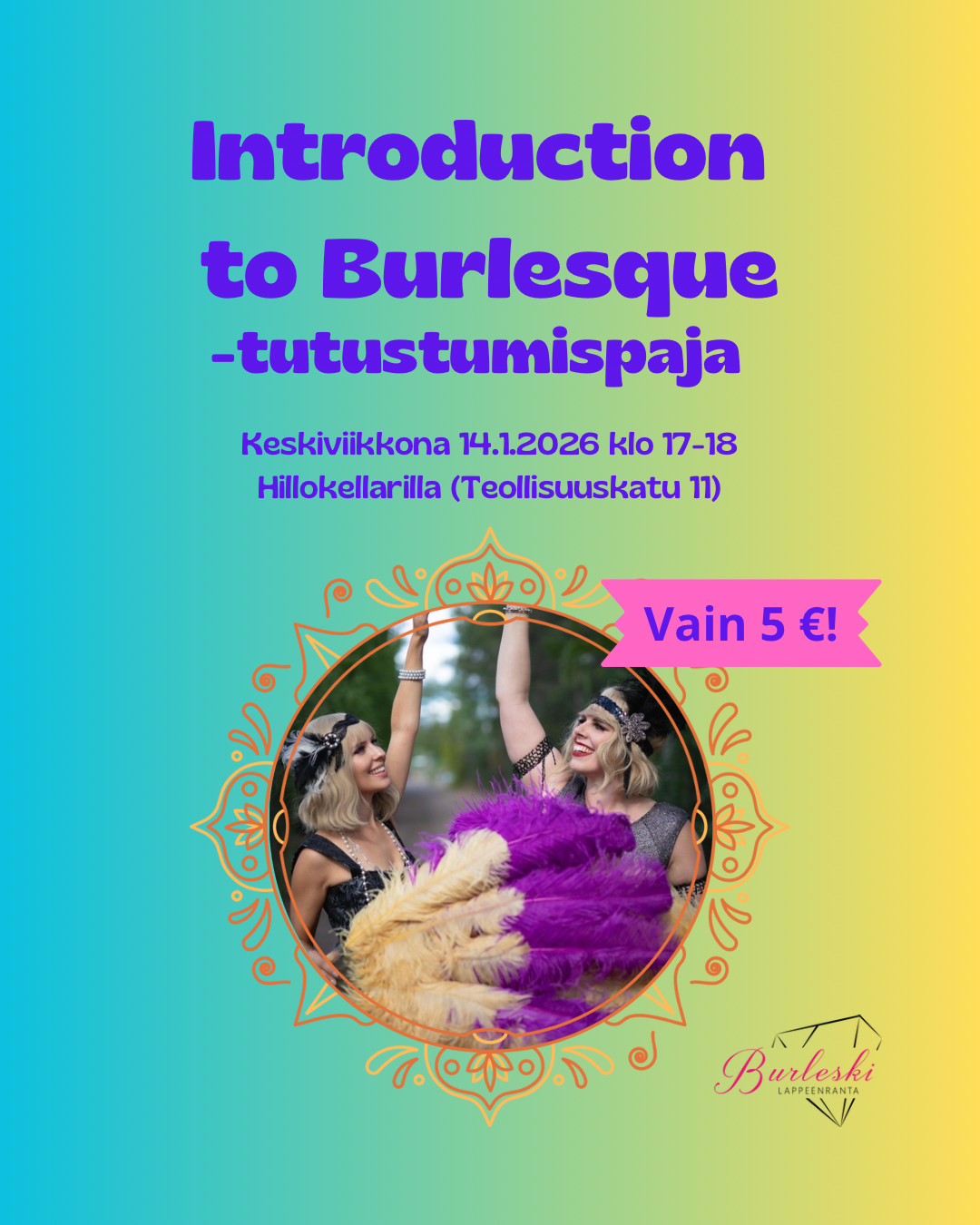 Tule tutustumaan burleskiin ja Lappeenranta Burleskin toimintaan keskiviikkona 14.1.2026 klo 17-18 Hillokellarille (Teollisuuskatu 11).